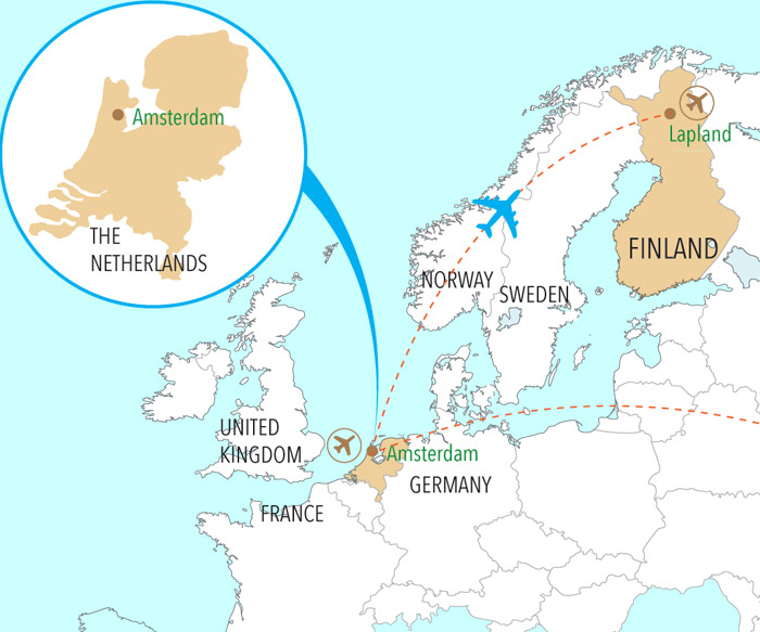 WHAT IS INCLUDED Dedicated bi-lingual muslim tour leader Halal meals Tour program observes solat times Printed information guide & tour program Pick up & Transfer : Airport Amsterdam & Lapland Pick up, drop-off from hotel Accommodation : Hotel in Amsterdam city center, private villa hotel in Lapland Guided visits: city of Amsterdam, traditional Dutch village Shopping tour in Amsterdam Shopping service (prepaid goods delivered to hotel room - only in Amsterdam) Private chef for dinner - only in Finland Luggage up to 20kg per person Shopping tour in Amsterdam